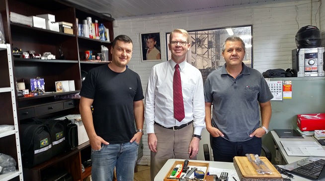 Ângelo Marcelo Chitolina e Marcelo Fritzen Theisen, proprietários da Macrotec, receberam das mãos de Vanderlei Henchen, da Enfoque, um presente comemorativo ao 5 anos como Cliente.