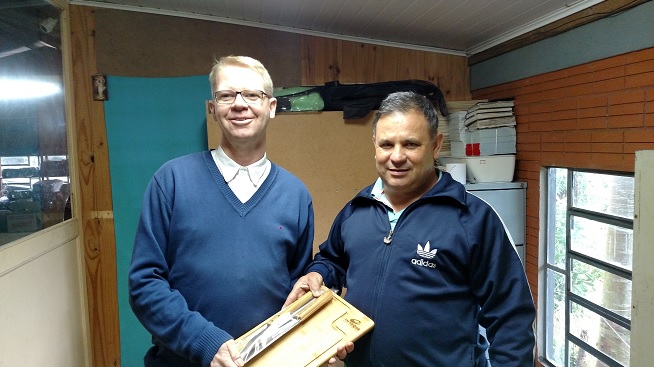 Waldocir Ferreira, pela Nefer, recebeu de Vanderlei Henchen, da Enfoque um presente comemorativo aos 5 anos como Cliente.