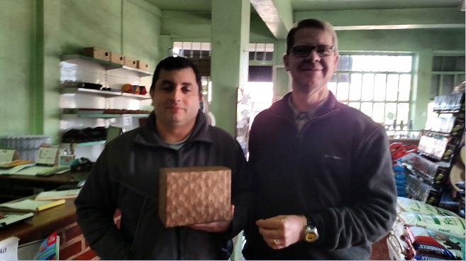 Cesar Osmar Arndt, proprietário da Casa das Sementes, recebeu de Vanderlei Henchen da Enfoque um presente comemorativo aos 5 anos como Cliente.