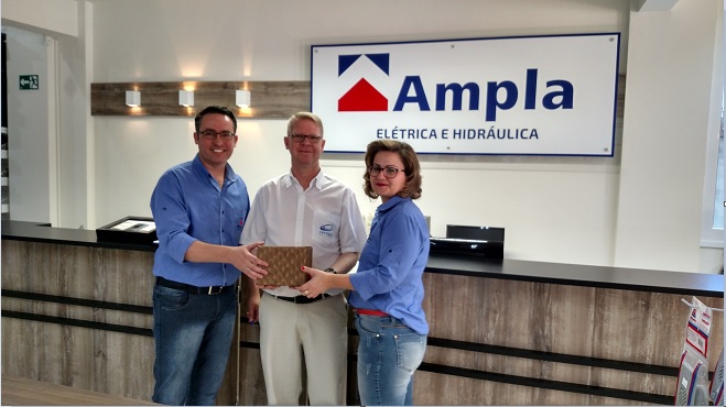 Everton e Janice, pela AMPLA, receberam de Vanderlei Henchen da Enfoque um presente comemorativo aos 5 anos como Cliente.