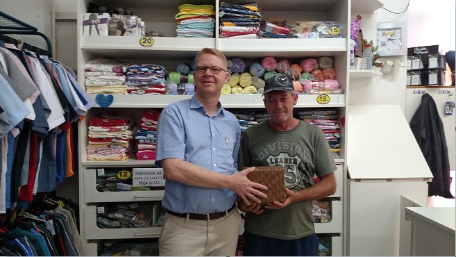 Paulo Sérgio Schneider, proprietário da LOJA PONTO 10, recebeu de Vanderlei Henchen, da Enfoque, um presente comemorativo aos 5 anos como Cliente.