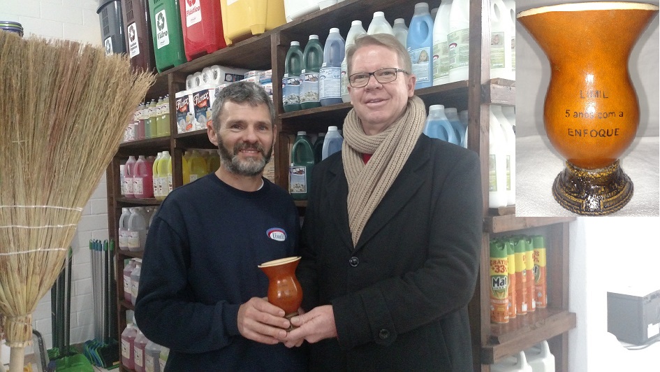 Marcos Antônio Linck, pela LIMIL, recebeu de Vanderlei Henchen da ENFOQUE uma Cuia para Chimarrão como presente comemorativo aos 5 anos como Cliente ENFOQUE.