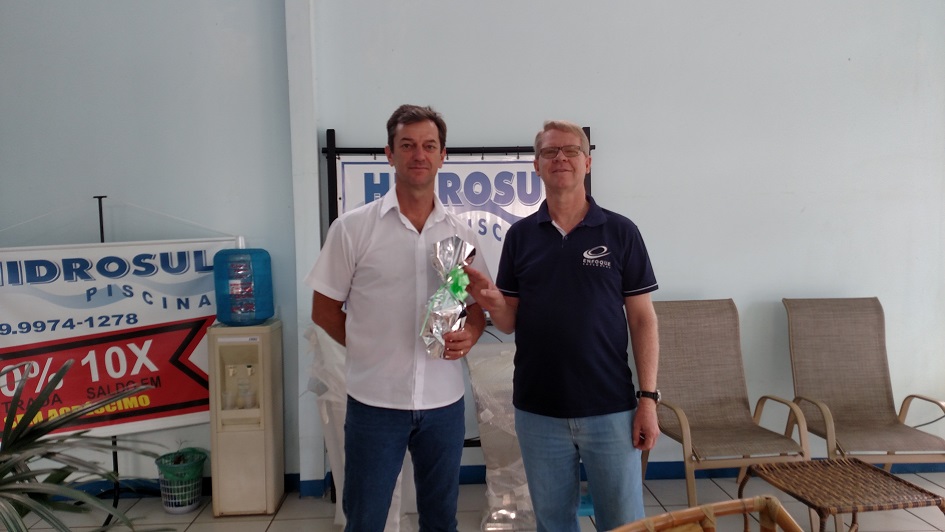 Wilson Wilmar Bourscheidt, proprietário da HIDROSUL PISCINAS, recebeu de Vanderlei Henchen da ENFOQUE, uma Cuia para Chimarrão como presente comemorativo aos 5 anos como Cliente ENFOQUE.