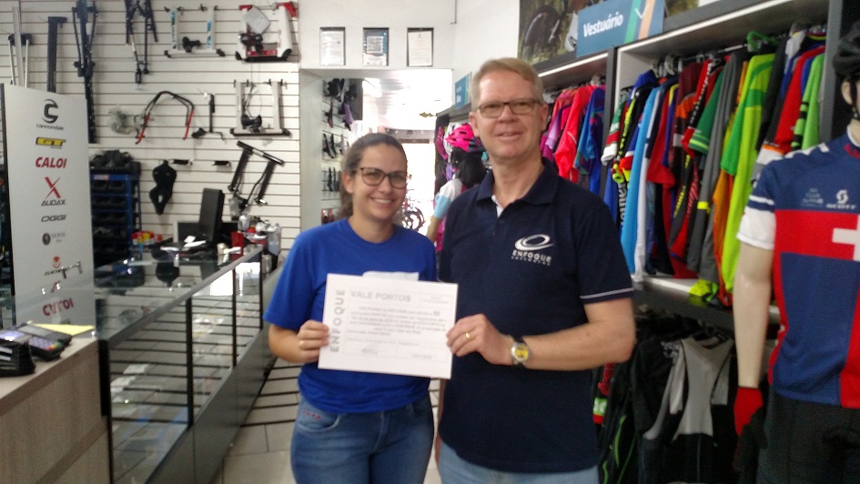 Tamara Wilkomm, pela GAGO BIKES, recebeu de Vanderlei Henchen da ENFOQUE, um VALE PONTOS com 50 pontos para serem utilizados como desconto junto a ENFOQUE ou em Convênios, como presente comemorativo aos 5 anos como Cliente ENFOQUE.