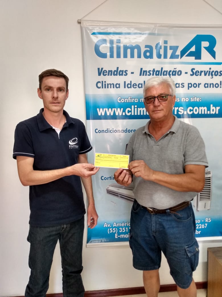 Carlos Alberto Timm, pela CLIMATIZAR, recebeu de Maurício Turra Vanzella da ENFOQUE um Bônus ENFOQUE comemorativo aos 5 anos como Cliente. Este Bônus pode ser utilizado para compras junto a Aliadas da ENFOQUE.
