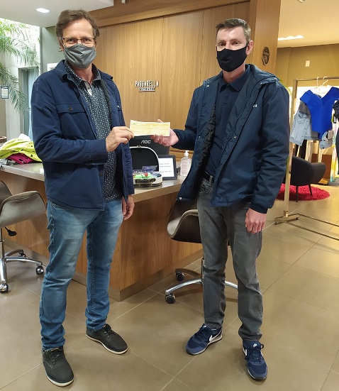 Vanderli de Vlieger, da PASSARELLA VILLE STYLE, recebeu de Maurício Turra Vanzella da ENFOQUE, um Bônus ENFOQUE comemorativo aos 10 anos como Cliente. Este Bônus pode ser utilizado para compras junto a Aliadas da ENFOQUE.